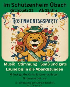 « Alle Veranstaltungen Rosenmontagparty 16. Februar 2026 ab 12:00 - 22:00 « Freitagtreff Freitagtreff » Geöffnet für alle Interessierten Zum Kalender hinzufügen Google Kalender iCalendar Outlook 365 Outlook Live Details Datum: 16. Februar 2026 Zeit: 12:00 - 22:00 Veranstaltungsort Schützenheim Übach Kirchplatz 11 Übach-Palenberg, Nordrhein-Westfalen 52531 Deutschland Google Karte anzeigen Veranstalter St. Sebastianus Schützenbruderschaft 1410 Übach e.V.